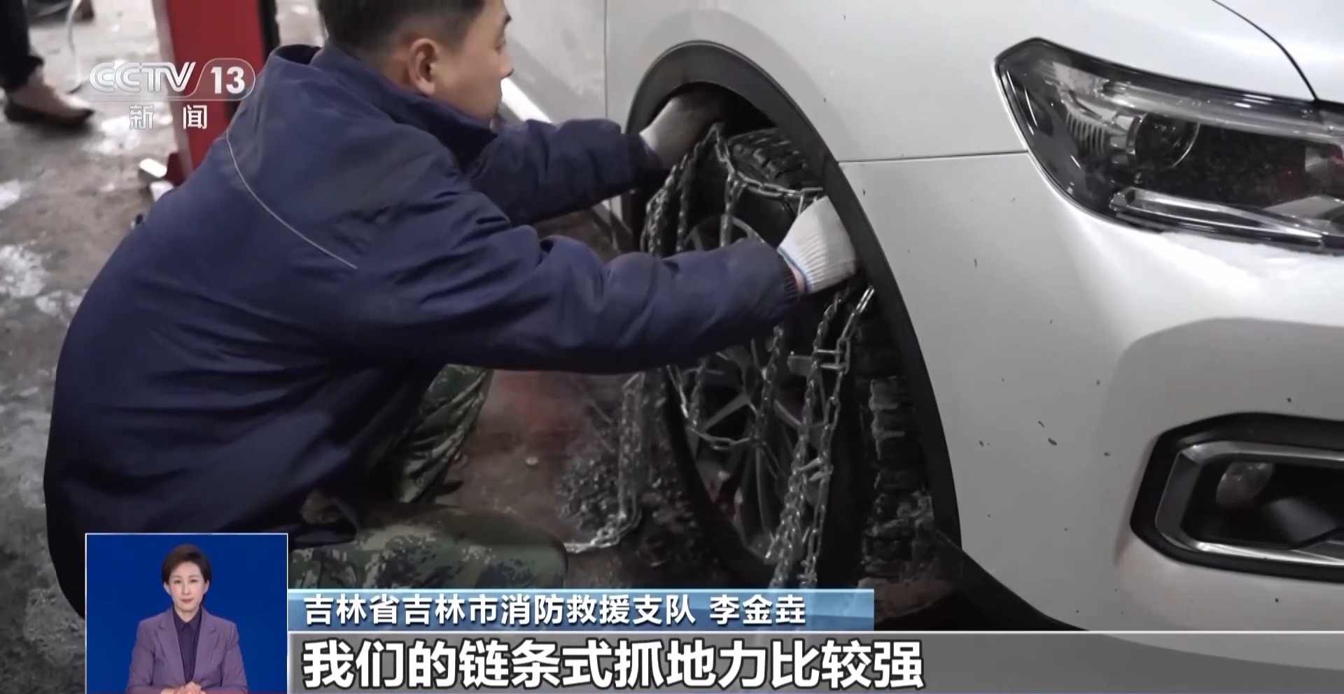 吉林省吉林市消防救援支队 李金垚:防滑链不是进入积雪的时候才进行安装,而是在进入积雪路段前就安装,车速不应该超过40km每小时。其次要选择类型,我们的链条式抓地力比较强。最后是安装的位置,前驱车要安在前面,后驱车要安在后面。四驱车建议全部安装。
