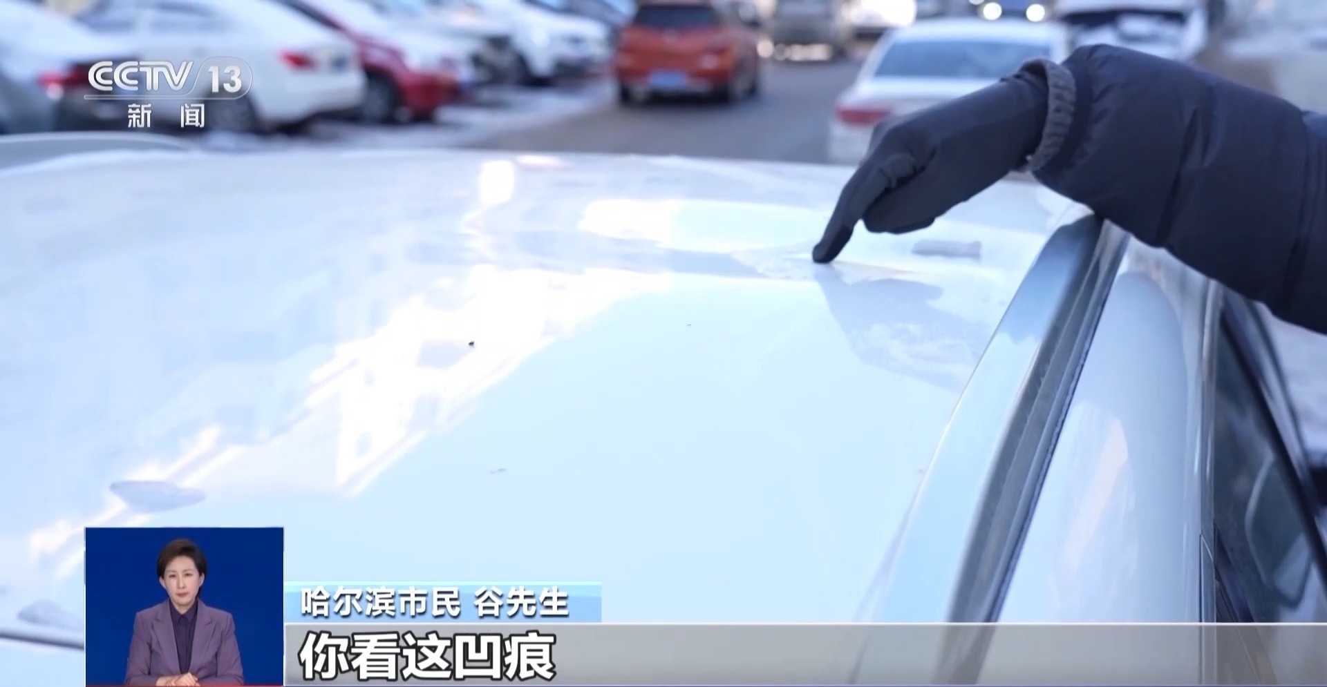 哈尔滨市民 谷先生:我车顶就是让“冰溜子”砸的,你看这凹痕。当时我是停在空调外机下面,我出来一看就这样了,挺后怕的,万一砸着人怎么办,确实太危险了。