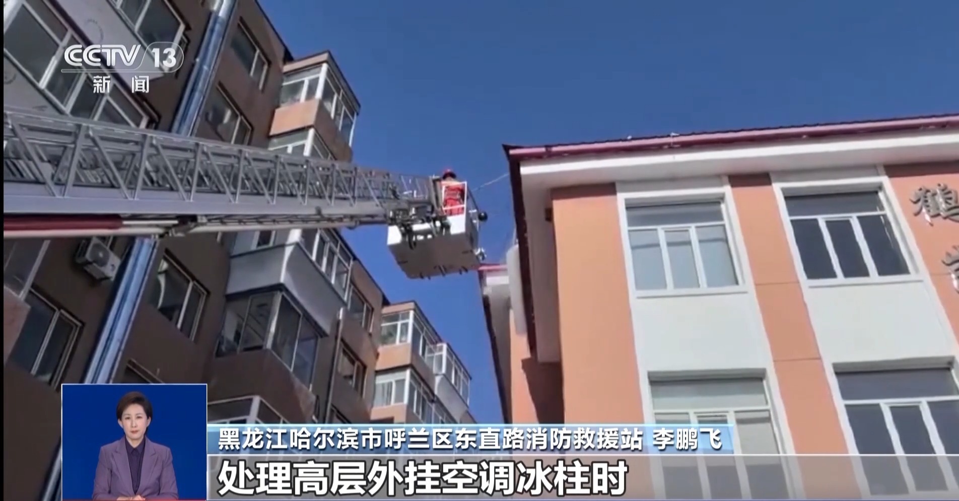 黑龙江哈尔滨市呼兰区东直路消防救援站 李鹏飞:处理5米以下冰柱时,应做好头部防护,戴好头盔,使用铁锹等工具,站在冰柱下方45度对冰柱进行敲击。处理高层外挂空调冰柱时,应提前挪开冰柱下方车辆,做好警戒区域,并且安排专人在安全区域提醒来往路人。遇到较大且危及人身安全的冰柱请及时求助消防部门。